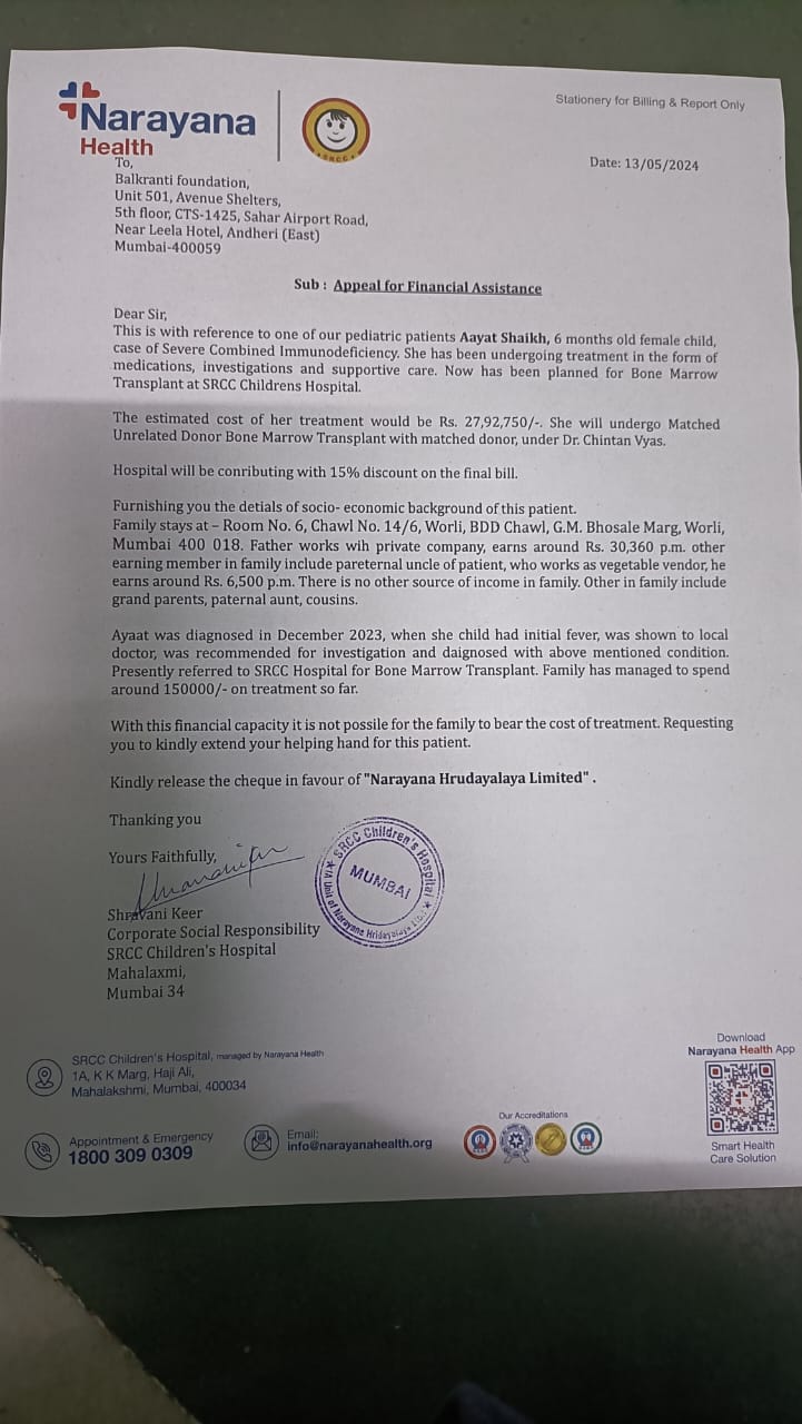 PATIENT DETAILS –Boy Aayat Shaikh is a 06 MOnth old boy child admitted in SRC hospital for children ,mumbai -400012. He is a case of Classical BMT (Type of Cancer) As the baby’s family has approached children’s Aadhar Foundation with great hope we humbly request you to please come forward with a helping hand and save this innocent’s life. Your small contribution can save a life. The boy’s family is struggling financially. They are unable to pay for her treatment. So, we request you to please save Baby’s life as he is in emergency medical need. Children’s aadhar Foundation is a Boy Child Right Organization which works for Education, Health & Nutrition for Girl Child, Other than this we work for early symptoms & Other Causes that are responsible for Heart Disease, Cancer & Other major disease. It is an independent organization, with no religious, political or governmental affiliations.