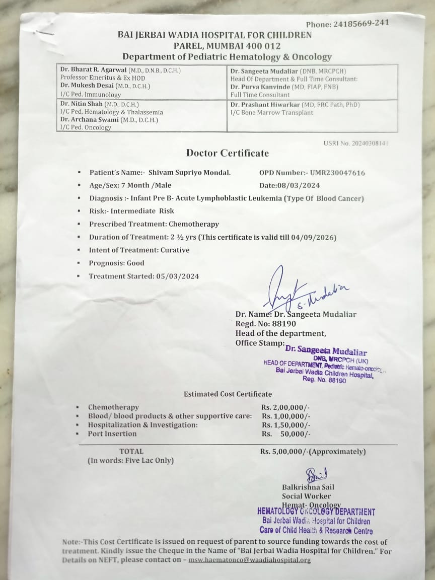 PATIENT DETAILS –Boy Shivam Supriyo Mondal is a 07 Year old boy child admitted in Bai Jerbai Wadia Hospital ,mumbai -400012. He is a case of B-Acute (Type of Cancer) As the baby’s family has approached children’s Aadhar Foundation with great hope we humbly request you to please come forward with a helping hand and save this innocent’s life. Your small contribution can save a life. The boy’s family is struggling financially. They are unable to pay for her treatment. So, we request you to please save Baby’s life as he is in emergency medical need. Children’s aadhar Foundation is a Boy Child Right Organization which works for Education, Health & Nutrition for Girl Child, Other than this we work for early symptoms & Other Causes that are responsible for Heart Disease, Cancer & Other major disease. It is an independent organization, with no religious, political or governmental affiliations.