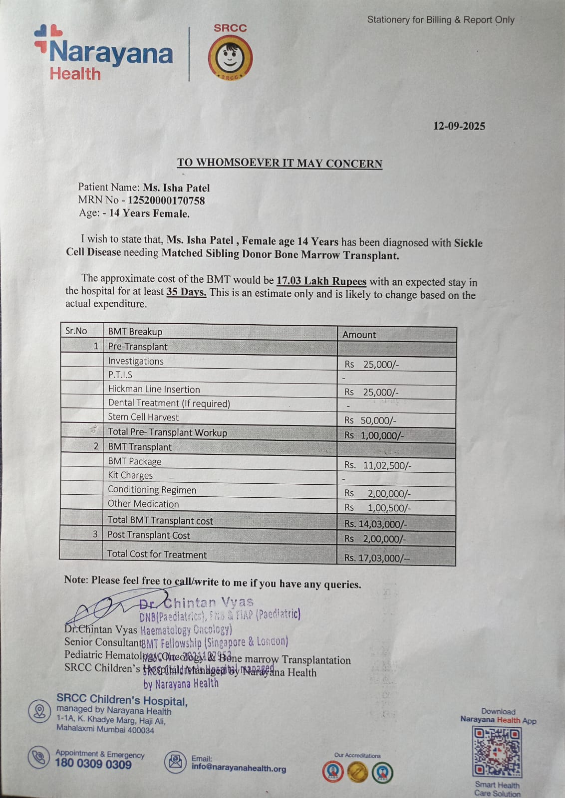 Ms. Isha Patel is a 14-year-old baby currently admitted to Narayana Health (Srcc) hospital, Mumbai – 400034. She has been diagnosed with Respiratory Distress Sickle Cell Disease (BMT). The baby’s family has approached Children's Aadhar Foundation with great hope. We humbly request you to come forward with a helping hand to save this innocent child’s life. Your small contribution can make a life-saving difference. The family is in severe financial distress and is unable to afford the cost of her treatment. We sincerely appeal to your kindness—please help save Baby Ms. Isha Patel’s life as she is in urgent need of medical care. Children's Aadhar Foundation is a Child Rights organization that works for the education, health, and nutrition of children—especially girl children. In addition, we focus on identifying early symptoms and addressing causes that lead to heart disease, cancer, and other major illnesses. We are an independent organization with no religious, political, or governmental affiliations.